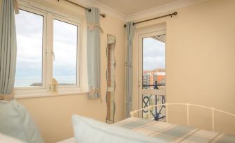 The master bedroom is a double with an ensuite shower room. This sea-facing room has a window with water views, plus a single French door giving access to the balcony. A built in wardrobe includes a chest of drawers, and with two bedsides, you've plenty of storage for your holiday clothes.