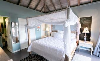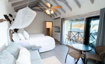 Stone steps from the center of the property's elevation lead to 3 self-contained guest cottages which may be added to a Villa rental. From its spacious patio, charming K’ai Etoile offers arresting scenes of the beach which is right in front of the balcony. Its delightfully decorated environs include an air-conditioned bedroom, living room with sleeper sofa for additional guests and fully-equipped kitchen. There is a television, bluetooth speaker, WIFI and a beautiful outdoor shower.