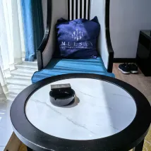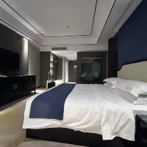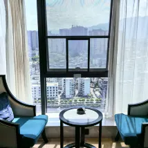 The hotel is located on the upper floors of the Heruncheng complex. It has a luxurious style and a blue dreamy color scheme. It is located near the river and is within walking distance of Tusi City. The service is detail-oriented. The bathroom has disposable toilet seats and disinfectant cotton pads. In hot weather, they also provide extra bottled water. The garden-style restaurant is romantic and warm. I actually saw an airplane flying by the window while dining.