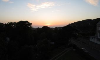 View of sunsets over the sea from all windows; view of the top of the downstream cliff and the arch illuminated in the evening.