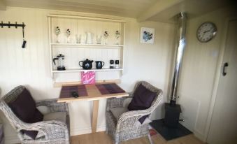 There is a fold down table with two chairs, a small log burning stove. There is a feeling of calm for people to de-stress chill out and relax.