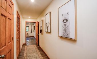 This contemporary mountain home has 3 floors, is over 5,000 square feet and walls adorned with artwork from Asheville, the Caribbean and South America. You'll have an expansive deck layout with a relaxing hot tub plus a game room for family and friends to entertain, have fun and enjoy. The main floor features an open concept layout that enhances the sense of space and encourages a seamless flow between the living, dining and kitchen areas, providing an ideal environment for entertaining your family and friends. The centerpiece of the living room is a grand fireplace, radiating warmth and adding a touch of rustic charm. It invites guests to gather around for cozy, relaxing evenings. Large trapezoidal windows on the main and top floor allow for warm natural sunlight to fill the great room. On the top floor, you'll have your choice of popular board games and a large selection of books for both kids and adults in the loft areas as well as two of the bedrooms, both with king size beds!