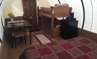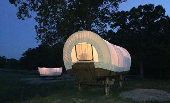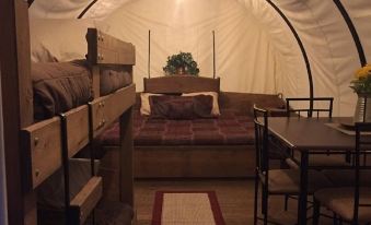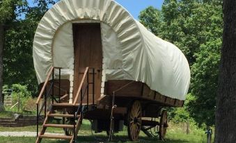 The Catawaba Trail Wagon has a king size bed with a 8" memory foam mattress as well as a set of bunk beds with memory foam mattresses as well. There is a table, mini fridge, and a coffee pot. The Wagon has electricity with plug ins, USB ports, Heat & Air!