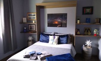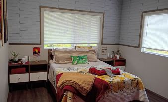 Both bedrooms offer Queen beds, ceiling fans, window shades or curtains as well as extra blankets and sheets for those cold nights. one room is themed after the fiery Volcano and the other themed after the starry skies of Mauna Kea.
