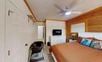 Find comfort and privacy in the primary bedroom, featuring an adjustable split king bed (two XL twin mattresses in a king frame), TV, and lighted vanity. There is a portable AC unit in the primary bedroom closet. The en suite bathroom has a double vanity and a tub/shower combination. Sleep soundly in a full-size bed in the second bedroom. The third bedroom is outfitted with a twin-over-full bunk bed, TV, and a sofa. The fourth bedroom offers a queen bed and a TV. The guest bathroom has a tub/shower combination. Extra perks include a washer/dryer, high chair, and Pack ‘n Play.