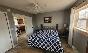 It is a cute little house with three bedrooms and one bathroom. The main bedroom and bathroom are both on the lower level with two more bedrooms upstairs. There is a basement, but it is unfinished, so we would prefer guests spend their time on the main two levels. There is a fire pit out back that you are welcome to use. We work hard to keep the property clean for you.