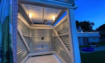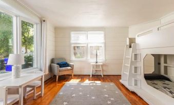 Upstairs has three bedrooms and one bathroom, plus a full kitchen, living room, and 500 sq foot back porch. Downstairs has a bedroom with a queen, a bonus room with a trundle bed, another full kitchen, a full bathroom, a spacious living room with foosball and a train table, and a covered back patio storage area. In the backyard there is a big enclosed outdoor shower and a trampoline and climbing dome (liability waiver required)