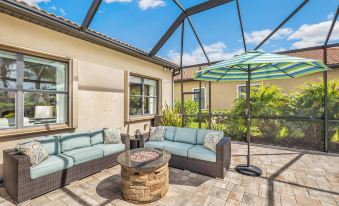 With an enviable western view, the outdoor living space behind the home will be well enjoyed by your and your group. Learn why Floridians spend as much time on their lanai as they do indoors - a sofa & loveseat with sun umbrella, shaded outdoor dining, gorgeous heated pool & spa - all look over the lake behind the home, with a beautiful day and night fountain view.