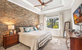 Privately located at the back of the home, the primary suite has a custom brick accent wall, which creates a cozy retreat for two. A king bed, made with provided linens, ceiling fan for added comfort, TV with cable, ensuite bathroom and walk-in closet complete the primary suite. The ensuite bathroom has a double sink vanity and large walk-in shower.