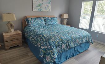 The unit can accommodate individuals who have difficulty with steps. There is no step into the house at the front entrance. If you have (or are renting) a scooter, you can drive it straight into the house. The bedroom with the queen bed is located on the first floor. The bathroom on the first floor has a small step into a walk-in shower with a grab bar.