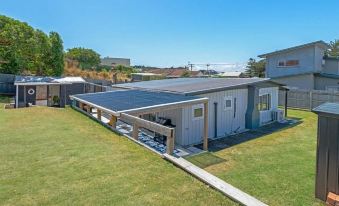 Cool little beach house in awesome location! Only a 5 min walk to the beach, estuary, kids park and bike track, and barely a 2 min walk to the local cafe. Two bedrooms, one with a queen sized bed, the other with a double bed, and a sleepout with two single beds. Modern bathroom and all new furniture. DVD library available for the rainy days and bodyboards for when you hit the beach. Two outdoor living areas with a BBQ, Pizza Oven and a great Spa Pool! Fully fenced section with secure off street parking.