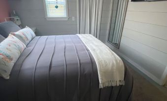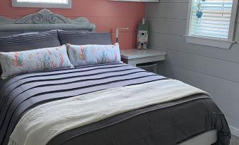 This little one bedroom beach bungalow offers a 1 queen bed in one room with its own full bath and tv . There are a set of bunkbeds in the hallway leading out to the back patio with its own full bath. The living room offers a large couch,TV, full kitchen and dining. There is a nice large screened back patio for cocktails and hanging out and relaxing also a large outside upper deck with views of the ocean and ample parking for numerous cars, boats and campers.
