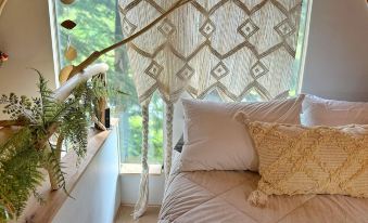 A queen bed nestled in the loft (perfect for stargazing through the skylights)