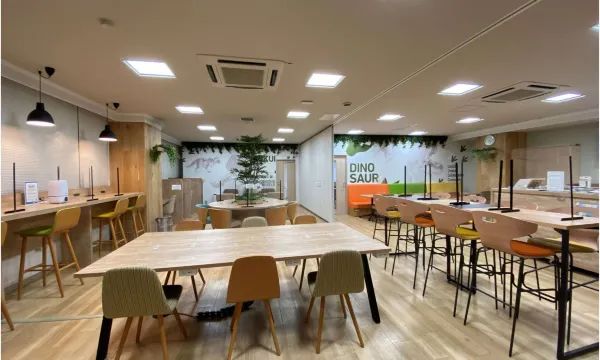 Free self-operated lockers at front (2nd floor) available before or after; coffee corner is nice; the free breakfast is simple but adequate and required to choose a 20-minutes time slot the day before; my room with good view of the train station and the Dino Kingdom