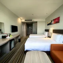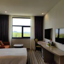 We book a room with 3 beds for 4 persons (1 child) The room a bit small for 4 persons. The bed is good. The aircon can not adjust for cool condition indeed it is a heater air con. When We went on 1-4 March 2024, when we enter to our room we feel uncomfortable because the room temp is so high and the window can open only a little, outside the room also very warm. No wind, no air movement so we turn on the aircon fan then the hot wind flow. So we shut down the hot aircon and borrow a fan from the hotel. Everything other than the warm room was nice, the hotel is beautiful, the staff are helpful. Manager tell me that all room booking weather you book with any agency are come with the ski, onsen and water park free package. You need to go to the ski center and show your passport and deposit money (2000 plus 40 rmb) to get ski card for using the ski facility. If you want to use outdoor onsen you need to bring swimwear and go to Wandajin and show the package paper you have got while checkin. You need to pay 10 rmb/person for using the locker and the towel. The process as same as water park. The breakfast is impressive.