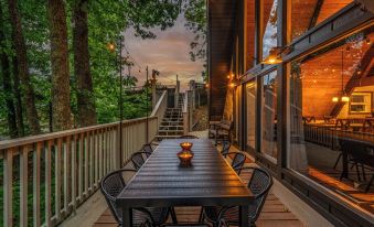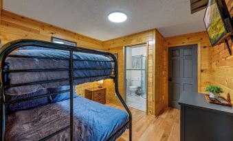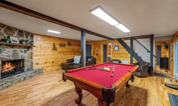 The cabin offers parking for up to three vehicles, with additional overflow parking available 0.9 miles away at the South Baden Clubhouse. Guests will need to walk down several steps to reach the deck and cabin entrance. The string-lit deck features an outdoor dining experience with stunning mountain views, especially in the fall. A charcoal grill is nearby. Inside, the main floor includes an open kitchen and living area with an electric fireplace, a queen pull-out sofa bed, and a fold-down futon. The main-floor bedroom has a king bed and deck access, with a bathroom located just across the hall. Upstairs, the loft bedroom also has a king bed, a private bathroom, and its own balcony. There is a twin sleeper located just outside this bedroom in the loft area. On the lowest level, one bedroom features a bunk bed (double on the bottom, single on top) with a private bath and deck access, while another bedroom has a full-sized bed and a private bath. This level also includes a spacious game room and living area with a pool table, an electric fireplace, and a washer/dryer. A separate deck with a hot tub can also be accessed from the lowest level. Photo captions provide additional details about the property.