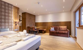 Reith bei Kitzbühel: Modern resort "Dorfresort Kitzbühel by AlpsResorts", 2 storeys. In the centre of Reith 6 km from the centre of Kitzbühel, 4 km from the lake, 5 km from the skiing area. For shared use: nat. Swimm. Pond. In the complex: sauna, steam room, hot tub, infrared sauna, relaxation room, spa area, storage room for bicycles, storage room for skis, central heating system. Parking at the house. Supermarket 500 m, restaurant 5 m, railway station "Kitzbühel Schwarzsee" 4 km. Skisport facilities 5 km, children's ski school 5 km. Well-known ski regions can easily be reached: KitzSki Hahnenkammbahn 6 km, Übungslift Reith 150 m. Well-known lakes can easily be reached: Schwarzsee 4 km. Please note: ski bus (free of charge). The holiday properties may differ in situation, size and location. Directly connected to the resort: Restaurant Reitherwirt! "mit 1 Schlafzimmer für 6 Personen", 2-room apartment 55 m2. Bright, tasteful furnishings: living/sleeping room with 1 double sofabed, dining table and satellite TV (flat screen). 1 room with 1 x 2 bunk beds, 1 double bed. Open kitchen (oven, dishwasher, 4 ceramic glass hob hotplates, toaster, kettle, electric coffee machine). Shower/WC. Balcony. Balcony furniture. Beautiful view of the mountains. Facilities: Internet (WiFi, free). Please note: non-smokers only. The property is one of a type of property or apartment.
