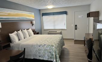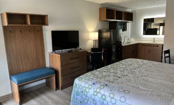This hotel was a revamped motel by Redroof Inns. The room wouldn’t seal correctly so it was very humid all of the time. There were clean sheets on the bed, one chair to sit in, a nice dresser, large TV, and the bathroom area was nice. Only one trashcan in the room. We ended up placing it in the bathroom. No fan in the bathroom - made it difficult to get dry after a shower. Staff was friendly.