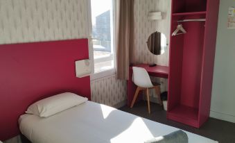 Hotel facile à trouver et à 100 m d'un restaurant. Chambre très propre, mais vraiment petite (lit, mini bureau, 1 chaise, 1 mini penderie). Salle de bain avec WC intégrés, faisant penser à celle d'un camping car. Attention aux personnes de forte corpulence, à qui je ne conseille pas cet hotel.La clim fonctionne, avec un bruit, certes pas important, mais qui peut déranger. On entend les bruits de l'autoroute très proche et la chambre n'a pas de volets, seulement des rideaux occultants, qui laissent passer la lumière ; attention à ceux qui ont le sommeil léger et ceux qui craignent les intrusions par la fenêtre (nous étions au rez-de-chaussée de chaussée et ce n'était pas très rassurant !). Les chambres ne sont pas vraiment insonorisées (nous avons entendu le voisin du dessus se déplacer dans sa chambre). La literie est tres ferme et les oreillers petits. La television fonctionne bien.Le petit-dejeuner était d'un bon rapport qualite/prix, avec de la variété. Attention pour les amateurs d'œufs brouillés, n'hésitez pas à en redemander s'il n'y en a plus, ils vous en referrons (je trouve ca bien, pour éviter le gaspillage alimentaire). Par contre, la viennoiserie n'est pas d'excellente qualité. Je ne pense pas revenir dans cet hôtel, que j'ai trouvé cher par rapport à la qualité de la chambre et prefererai dépenser quelques euros de plus pour avoir une chambre plus spacieuse, insonorisée correctement et avec des volets ou stores qui font leur job correctement.