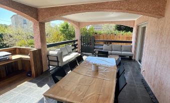 A covered terrace with dining table for 8 people, a lounge area and plancha area