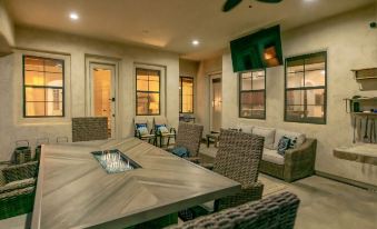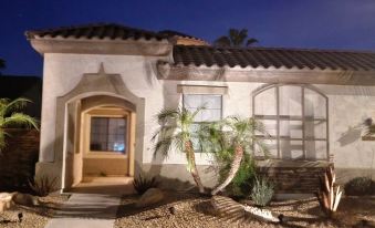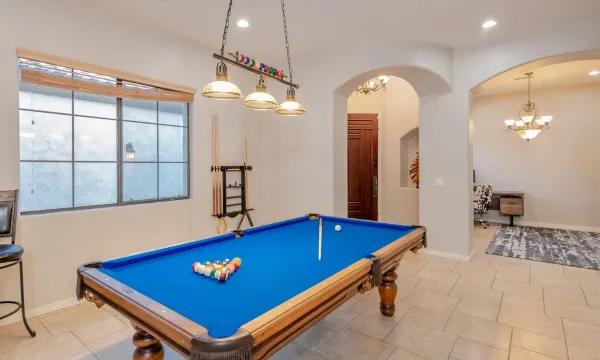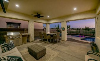 The good life~ Your own private getaway'~ Simply sit back and watch the golfers while you soak up the Arizona rays. Looking for fun in the sun? Play in the resort style heated salt water pool & spa complete with basketball hoop and plenty of pool toys, catch the game on the outdoor TV, play some golf on your own putting green, BBQ on the grill, maybe a game of corn hole or enjoy a quiet evening dinning under the covered patio while watching the stunning mountain sunsets, or retreat inside & play a game of Billiards, enjoy the provided board games or chill and grab a movie on Netflix plus local COX cable channels. Plenty of WIFI to go around with 2 services so have confidence all your devises should connect with no problem. Primary bedroom boasts a 5 piece bath with soaking tub & private entry to the covered patio enjoy sleeping on the top of the line adjustable bed with massage. 2 additional rooms with queen beds & ceiling fans, bunk room has two double beds & a twin, office has space for air mattresses (two provided).Kitchen is open to the living area and stocked with all the necessities. Pool table room has TV and pub table, full size washer & dryer, 1 space available for small to mid size car in garage, plenty of driveway parking. 1 mile to restaurants galore & shopping. Less than 20 minutes to the State farm stadium. 3 minutes to the movie theatre. 10 minutes to multiple spring training facilities. 24 minutes to the airport. It really is the Good life in Goodyear. Pool/spa heat is an extra charge.About pets:Pets allowed: dogs less than 50 lbs per pet (limit one pet total).Must be approved via host.About checkOut:Check out before 11:00 AM.About children:Children allowed: ages 0-17.About checkIn:Check in after 4:00 PM.About smoking:Smoking is not permitted.About minBookingAge:Minimum age to rent: 27.About events:No events allowed.