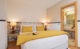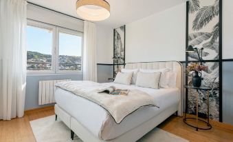 Upon entering, a welcoming foyer leads to a grand living room of over 60 square meters, divided into three areas: a dining room with an elegant round table that seats eight, a lounge with designer sofas and a 55-inch Smart TV, and a relaxing area with armchairs, all flooded with natural light from large windows. The adjoining balcony offers unparalleled views of Granada’s most iconic landmarks.