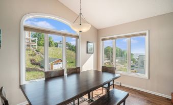 Take in sunrise coffee or a sunset dinner on the wraparound deck with lake views.