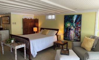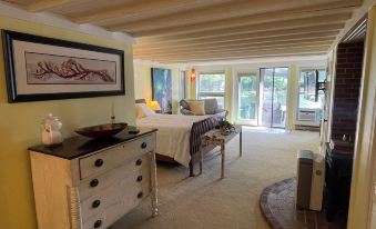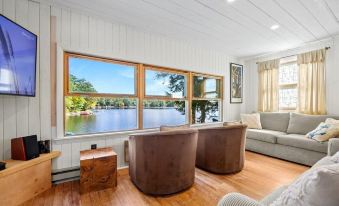 Going down from the main floor, you have the Guest bedroom which features direct access to the lakefront patio with awesome lake views, a private bathroom with custom tiled shower, a Queen bed, couch and 55 inch TV with Youtube TV, Amazon Prime & Netflix.