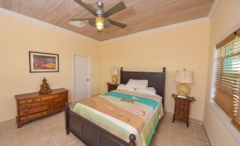 2 large bedrooms with ensuite bathrooms. One bedroom has a King Sized bed and the other has a double. The furniture is Indonesian antiques acquired during our time in the Far East. Top quality accommodation on par with the villa next door. Please see the photographs which give a flavor of the property. We are located on a rocky elevated peninsula. The elevation provides the stunning views and refreshing breezes. Access to the beautiful Hooper's Bay Beach is a gentle 5 minute stroll. We have just installed Fiber Optic Broadband.