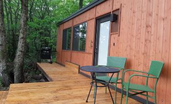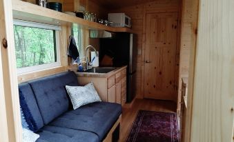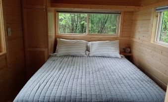 This little cabin in the woods over looking a prairie is a great space for travelers that like to be cozy and secluded.
