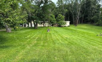 The Guest House is thoughtfully furnished with 1 king bed, 1 queen size bed, 1 queen sofa bed. The living room has 50” TV (second TV in BR), electric fireplace, WiFi. The kitchen is very well equipped including a spice rack, wine, champagne, martini & margarita glasses, brandy snifters & frosted beer mugs, dishes, pots & pans, utensils, microwave,/convection oven, toaster, blender, Kurig coffee maker ( coffee, tea, hot chocolate), dishwasher & washer & dryer (detergent supplied). The dining area has views of the private backyard surrounded by stone walls (circa 1820’s) and woods with an outdoor fire pit, 5 burner gas grill w/side burner, charcoal BBQ grill, patio furniture w/umbrella, swing set, 2 hammocks. The front deck has patio furniture. We border Sunny Hill Golf Course (9 golf courses within a 14 mile radius). 32 minutes to Ski Windham. Our guests are invited to hike on 4+ miles of private trails & picnic areas on our 110 acres, visit with our horses, take the 12' rowboat & pedal boat on the pond. Heat & air conditioning.