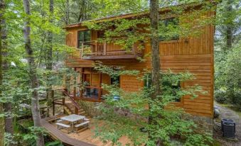 Escape to this charming, one-of-a-kind cabin in picturesque Cleveland, SC. With 3 cozy BRs including a king, and two queen beds, guests will feel right at home. A futon in the upstairs living space allows comfortablesleeping room for an additional 2 guests. The downstairs features a full kitchen, living room w/TV, bedroom, bathroom, laundry room, and dining room overlooking the river. Head upstairs to enjoy a second living room with convertible seating/sleeping futon. Game room has a wet bar, pool table, ping pong, and poker tables, and a balcony that overlooks the porch and river. The primary bedroom has balcony access as well. The interior of the home was constructed with custom maple paneling, walnut trim, walnut beams and cabinets, hardwood floors, granite counter tops, travertine tile, walk in glass showers, etc...