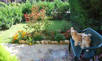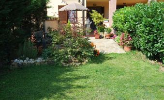 Two gardens, room with exit to the entrance garden. In the ONLY ROOM there is both the DOUBLE BED and a BED used as a sofa. On request TRAVEL BED for BABY. Bathroom with shower and bidet and kitchen with small terrace, ideal for quiet breakfasts and outdoor meals and the patio below ideal for sunbathing. The kitchen is equipped with gas stove, oven, refrigerator, toaster, microwave, cooking pans and pots, cutlery.