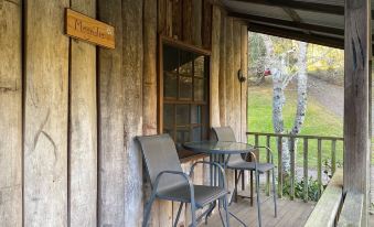 Magnolia Cottage is one of five secluded, private, self-contained rustic cabins, each in their own separate area of forest on the property. They are available individually or as a group for up to 24 people. A tennis court is available for use up at the main house.