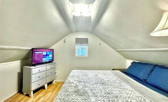 - Bedroom: queen sized bed, small dresser, and smart TV