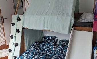 4 bedrooms: 5 single beds 1 sofa bed and 1 queen bed