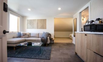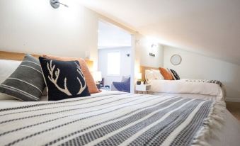 Mountain Modern is situated above the main garage and has a separate entrance with keypad entry and dedicated parking for our guests. The extra large bedroom has a slanted ceiling and is set up with two queen beds, complete with organic bedding. The oversized luxury bathroom has a walk-in glass enclosed shower outfitted with shampoo, condition and bodywash. There is a kitchenette with sink, mini fridge, microwave, toaster oven, toaster, kettle and electric griddle provided for light cooking and reheating of food. And a stackable washer and dryer in the unit that includes laundry detergent and dryer sheets for your personal use. The kitchenette also has a french press and Mr. Coffee coffeemaker (coffee and sugar + honey provided). It has all the modern conveniences from home one could ever need.