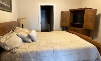 To the right of the living area is the Primary bedroom with King bed, TV in the armoire and en suite Full bathroom.