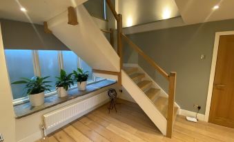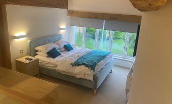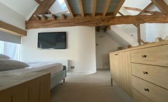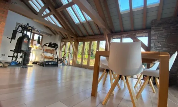 With contemporary decor, the large open-plan layout is flooded with natural light, providing direct access to your own garden space and seating area where you can enjoy the summer evenings with views out to the hills. Or why not light the log-burner and cosy up, perfect for recharging your batteries. Natural oak floors and extensive glazed oak frames provide a very modern, yet traditional ambience. The ground floor provides an open plan kitchen, living and dining area, as well as a downstairs cloakroom. The fully equipped kitchen has a washer/ dryer, dishwasher, cooker, fridge with freezer compartment and microwave. A large flat-screen TV is provided, with surround sound, Sky TV, Netflix, Amazon Prime Video and free WIFI, so you can enjoy your home comforts if wished. Included on the ground floor is a gym area with multi-gym and treadmill for those with energy to spare. The first floor provides a sizeable open plan bedroom with vaulted ceilings and far-reaching views out to the Brecon Beacons including Pen y Fan, the highest peak in South Wales. A comfortable king size bed awaits you, with a large screen TV and en-suite shower room at your disposal. Bed linen, towels and toiletries are provided.