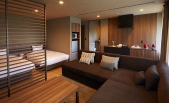 "Naka-niwa" has a foot bath (hot spring) and a bonfire pit on the wooden deck, and the "library" has a collection of about 700 books. Guests can gather in the lounge and spend time relaxing in their favorite spot.