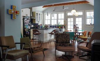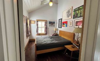 The house has a full bathroom with a tub upstairs and a half bath downstairs. There are 2 bedrooms upstairs and a comfortable daybed in the cactus room – can easily sleep 5. There’s an outdoor shower for warmer months. We would love to host people who can appreciate cute plants and quirky decor.