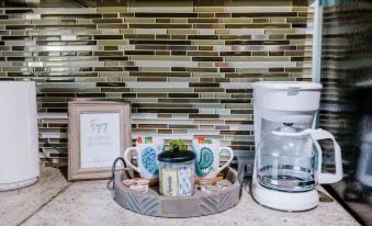 Cook up a storm in this fully equipped kitchen. Stainless steel appliances, including a Drip Coffee Maker for starting your mornings right, and easy. With a range, double wide fridge with Ice Maker, and microwave, plus new cookware, dishware, and an ultra quiet dishwasher- cleanup is a breeze.