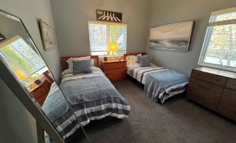 Second floor features two bedrooms, one with queen bed and en-suite bath (with whirlpool tub), the other with two twins and a semi-private bath.