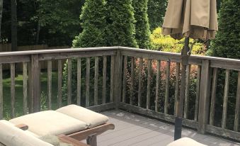 On the first floor is the master bedroom with king bed, and a whirlpool tub and separate shower in the master bath. Two other bedrooms on the first floor, each with two twin beds, plus one additional full bathroom downstairs. Fully-equipped kitchen, with gas range, microwave, two coffee makers (1 Keurig and 1 Drip) and chef's-grade cookware. Dining room and family room with TV and Sonos system also on first floor. Large decks off of both dining room and master bedroom facing the pool and back yard. Large gas grill on deck with connection to house propane tank (No refilling necessary.) Dining table for 8 on deck.