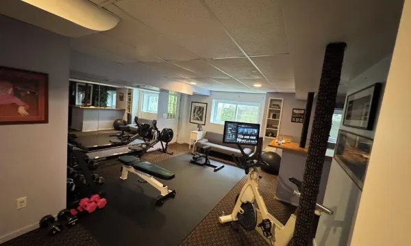 The finished basement features a full gym, with Bodi bike and free exercise class programming, an ERG Concept 2 rowing machine, free weights, adjustable bench, sissy squat machine, etc. There is also a bar and a full bathroom with shower, all with direct access to the back yard. There is a second full-sized washer/dryer in the basement.