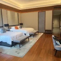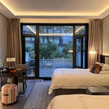 The 80-square-meter family room was incredibly comfortable. We had L'Occitane toiletries and a fully automated toilet. The hotel is located in Wang Zhuang, and our Building 2 directly faced the Three Pools Mirroring the Moon, offering unbeatable scenery everywhere you looked. Hotel guests received a discount at the West Garden Teahouse, with buy-one-get-one-free on tea and complimentary snacks. It's a shame it was a one-time discount; it would have been great to have it multiple times during our stay. The hotel also offered ancient costume photography, which my daughter tried and absolutely loved! 👍🏻 All the hotel staff were excellent, especially Butler Xiao Deng from Building 2, who helped me mail back clothes I'd forgotten. I'm very grateful for that.