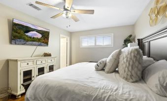 This home has three bedrooms with four beds, as well as a sofa bed in the office. The primary bedroom has a luxurious king bed as well as a full on-suite and large closet.