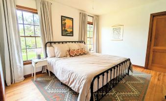 The house has two private bedrooms with a queen and king bed respectively, plus a private area in the second living room with three twin beds. A surprising number of doors means that even though the house is small, the back of the house stays quiet and peaceful even when you're cooking or socializing in the front living room.
