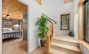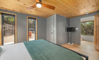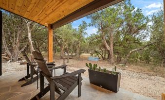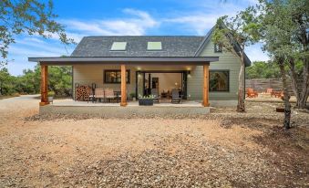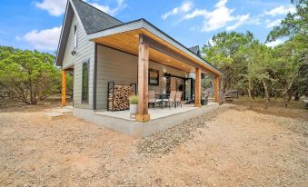 Get away from it all in this cozy Wimberley retreat! This brand new 2-bedroom, 1-bathroom cabin offers a place to get closer to nature, with all the comforts of home. You have a fully equipped kitchen, plus a spa inspired bathroom. The downstairs bedroom offers a King bed, and upstairs there is a daybed that converts to a King. Unwind in the hot tub under the stars, gather around the fire pit for s'mores or a glass of wine, and enjoy a refreshing outdoor shower surrounded by the nature. The cabin has one enclosed primary bedroom with a King bed. The other bedroom is an upstairs open air loft with game table. The daybed can be used as a twin, or can fold out into a king bed as well. Curl up by the wood burning stove on those cool winter evenings. Open up 10 foot accordion style door when you want to bring the outdoors in. You will love the luxury shower with an overhead rain shower head, standard shower head, and hand held as well.