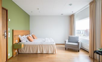 You can't get better value for money anywhere else! I paid only 165 euros (including taxes) for one night in May and I got an excellent junior suite with a furnished balcony and an own electric sauna in this centrally located hotel. However, the best part of my junior suite was the stunning sea view to the Bay of Lauttasaarensalmi, the Crusell Bridge (read separate Tripadvisor reviews of it) and the Ruoholahti Canal (read separate Tripadvisor reviews of it, too). There was a big window even in the bathroom! There are obvious reasons for cheap prices. This is a small hotel with only 13 rooms and there isn't any staff in the hotel. So there aren't any reception services or breakfast in the hotel. You only get a key code by e-mail or by text message 30-60 minutes before check-in time. It was quite hard to find the main door of the hotel but after that everything worked well. For your notice, the entrance is situated on the street corner of Länsisatamankatu 16 and Martin Wegeliuksen kuja. Lack of breakfast isn't any problem. You find a small shared kitchen and a big shared living room with three microwave ovens, electric kettles and a coffee machine in the hotel. Besides, I had a fridge and a freezer in my room. There are also several cafeterias and restaurants near the hotel. There is also a shared laundry room in the hotel. I stayed in the junior suite alone but it is ok for 2-3 people, too. You find two beds and a single sofa bed chair in the junior suite. You can enjoy self-adjustable air conditioning, a portable air-conditioning machine, a television, a big shower, an electric sauna and a large balcony in the junior suite. The hotel is situated on the 5th floor (or on the 4th floor if the ground floor is 0) and so you can see the panorama of Ruoholahti area. Actually Hiisi Hotel is located at the border of Ruoholahti and Jätkäsaari, on the bank of Ruoholahti Canal, on the side of Jätkäsaari. The hotel is situated within walking distance of the city center (2.5 kilometers from the central railway station and the Esplanade Park). Jätkäsaari is the new residential area of Helsinki. You find beautiful new houses, cozy parks, scenic walking routes and interesting restaurants there. There are still some construction works in Jätkäsaari but the area surrounding the hotel is ready and you won't hear any noise there. I only had two problems in Hiisi Hotel. Windows were quite dirty and they should be cleaned. Secondly I didn't like the smell of the liquid hand soap (actually it was said to be fragrance-free). So you see that I only had minor problems and this hotel is almost perfect if you don't mind the lack of service. However, final cleaning is included in room prices. I really recommend that you should book this junior suite and enjoy the stunning view. Besides, it is wonderful to sit at the balcony and enjoy the architecture of the Crusell Bridge and bright summer nights!